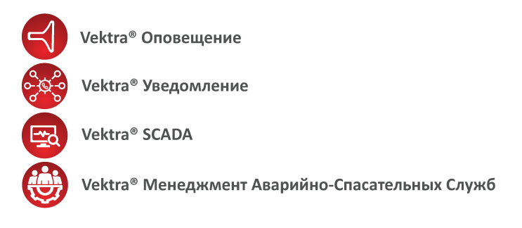 Vektra® Оповещение предоставляет вам возможность управлять акустическими устройствами оповещения и запускать сигналы тревоги в опасной ситуации. Vektra® Уведомление используется для созыва всех ответственных лиц на место чрезвычайного происшествия. Vektra® SCADA позволяет вам управлять индивидуально контролируемыми элементами, такими как ворота, климатическое оборудование, громкоговорители и CCTV, а также контролировать устройства мониторинга (датчики для измерения уровня вредных веществ в воздухе, уровня воды, критических скоростей потоков и других). Более того, есть Vektra Менеджмент Аварийно-Спасательных Служб® обеспечивающая автоматический менеджмент спасательных и чрезвычайных операций.
